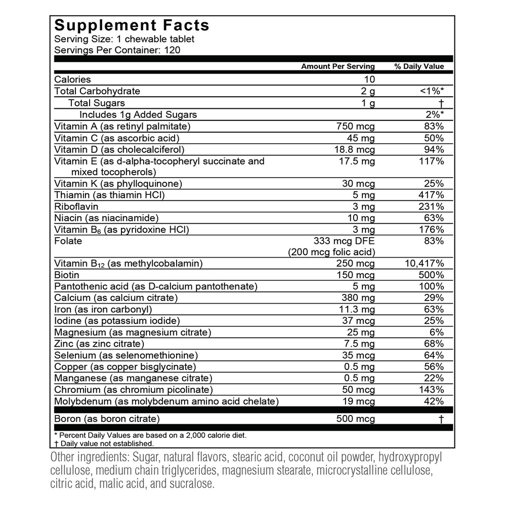 Isso não é tudo. Possui grandes quantidades de vitaminas e minerais de alto risco para pacientes bariátricos, incluindo vitamina B12, tiamina (B1), biotina e zinco. Este mastigável completo inclui vitaminas C, E e A, outras vitaminas B e iodo, manganês, cobre e cromo.